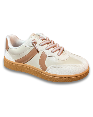 O calce é com cadarço bicolor (rosa e branco), que além de prático permite ajuste eficiente e visual harmonioso. O conforto vem da palmilha acolchoada em EVA e do forro têxtil macio, que colaboram para um uso prolongado com bem-estar. Já o solado em borracha PVC estilo flat, na cor caramelo, garante leveza, aderência e segurança nos passos