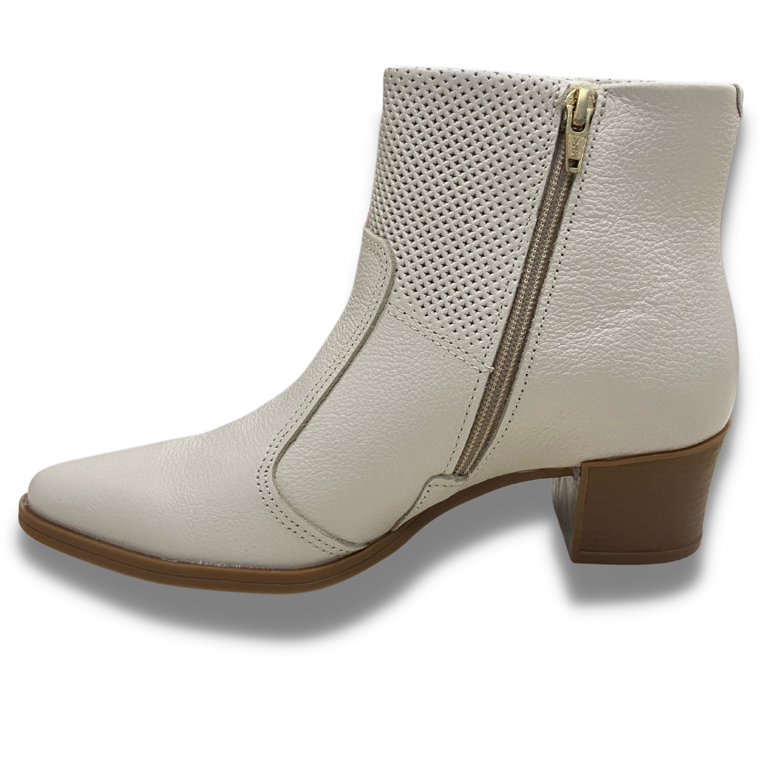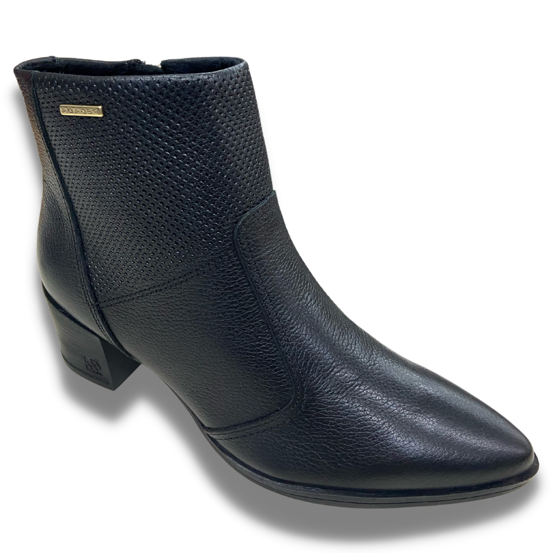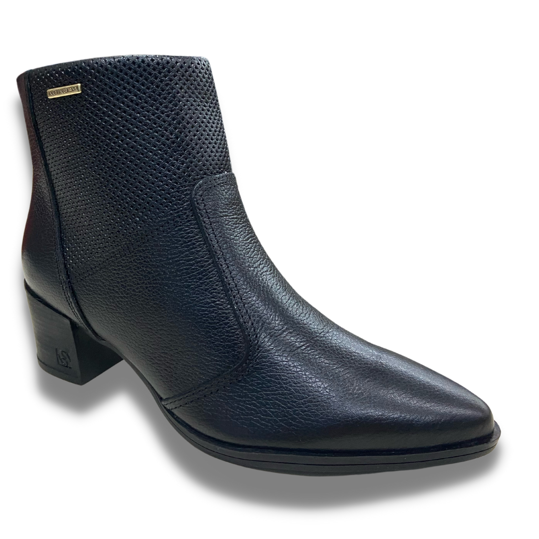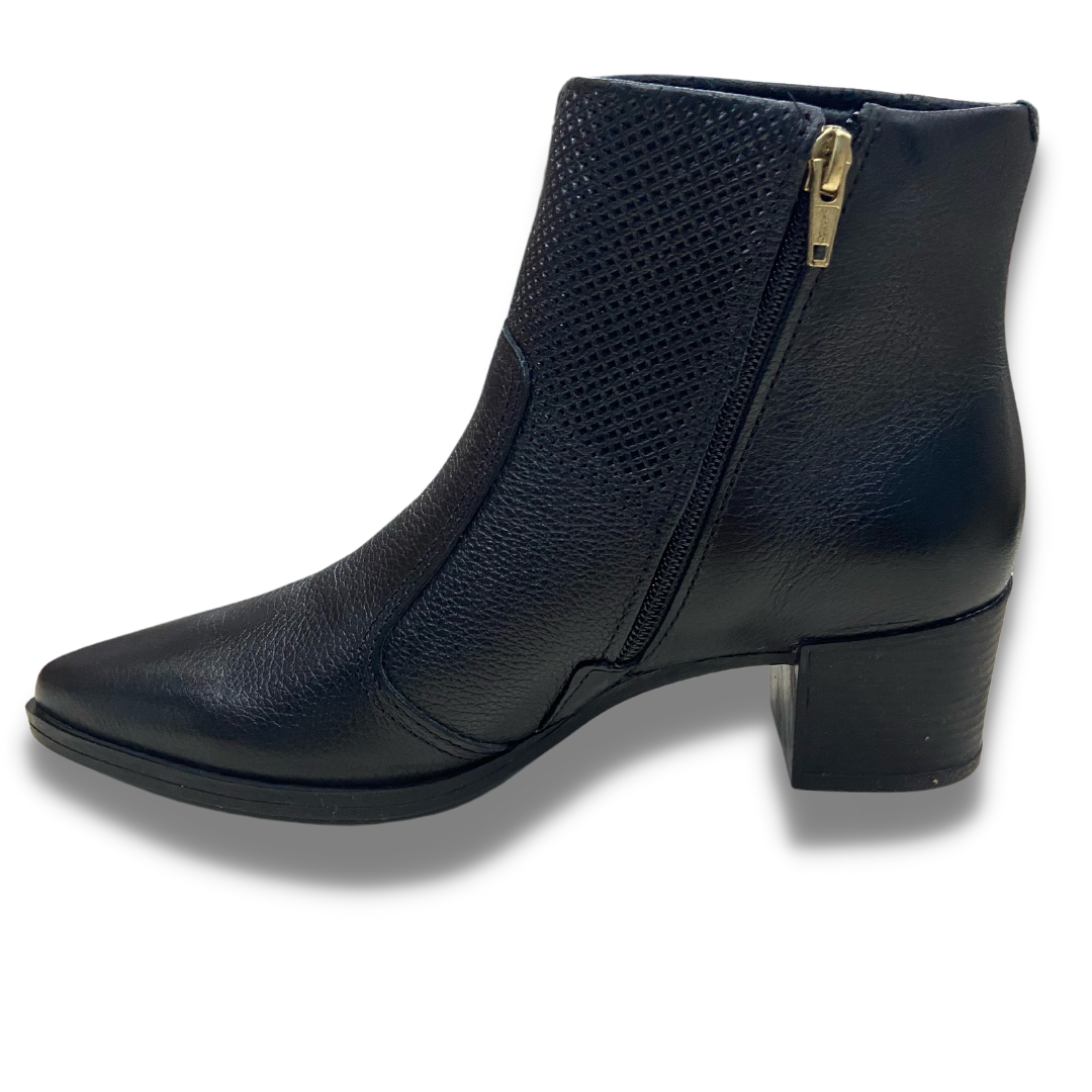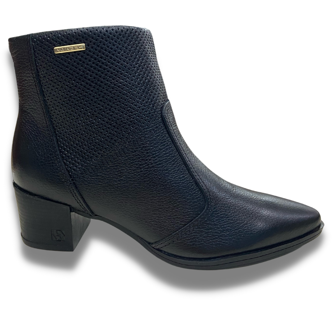 Bota em couro macio qualidade Pegada, tem bico fino no estilo clássico com detalhes na lateral que trazem um toque de modernidade ao modelo. Salto quadrado conforto de 5cm, ziper na lateral e forro quentinho.