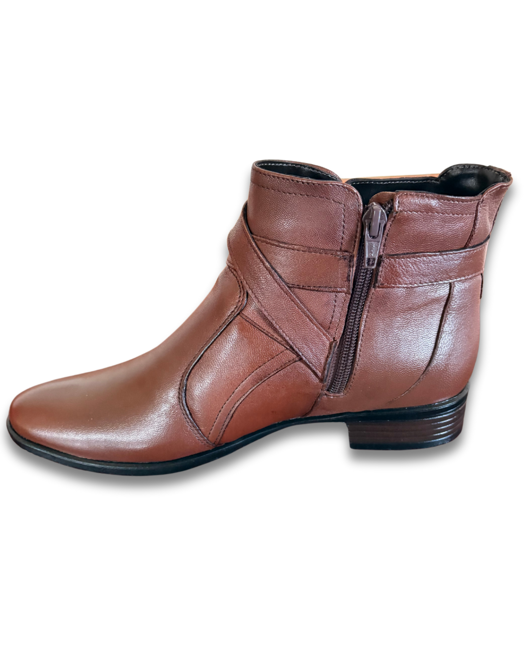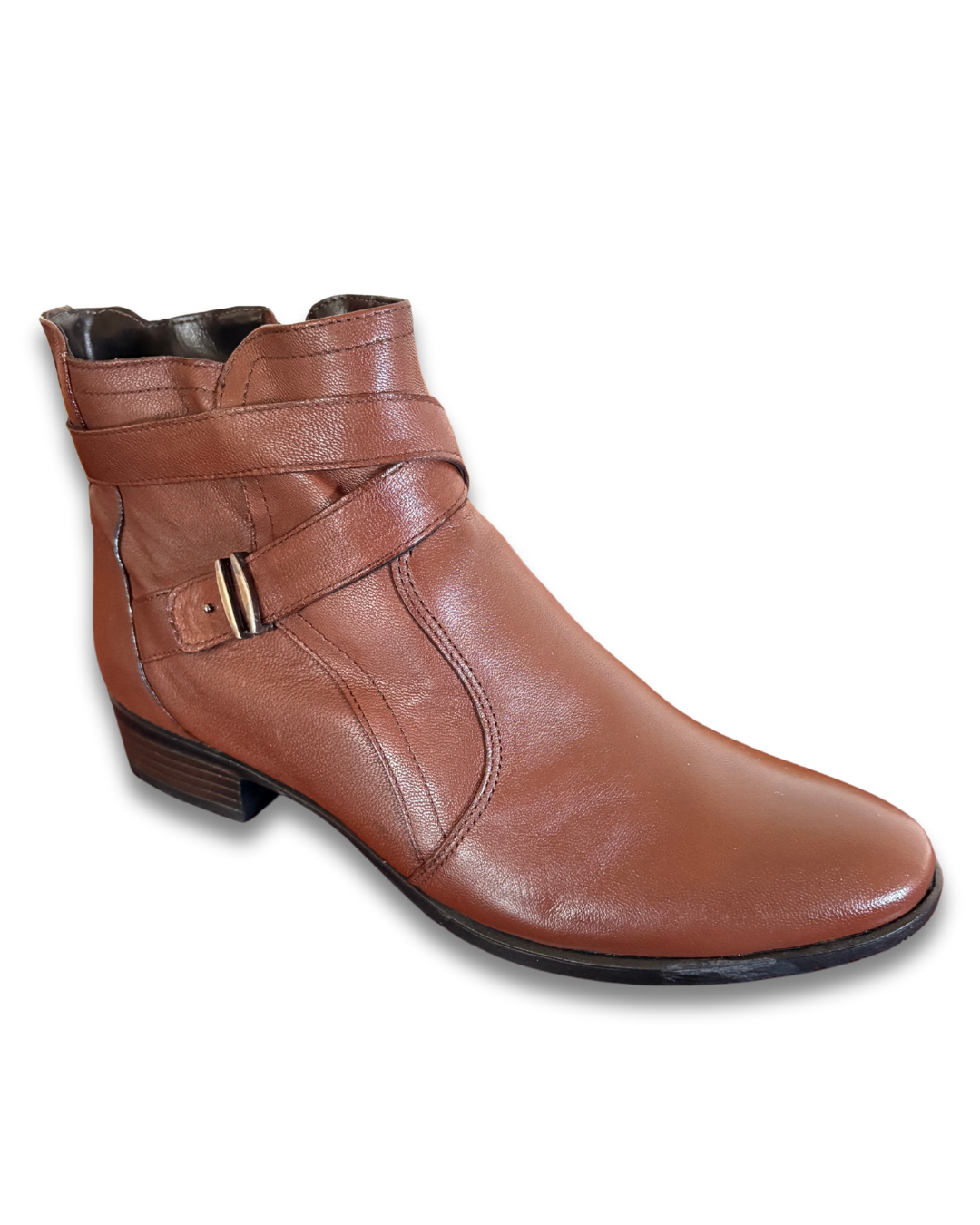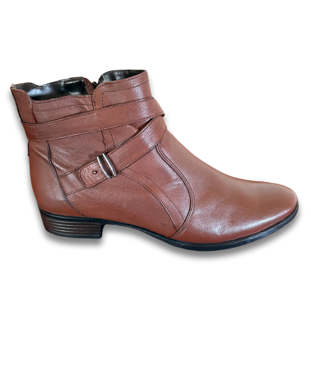 Bota Feminina Bottero 346915 em couro legítimo com acabamento burnish. Modelo de cano baixo, salto bloco de 6 cm, fechamento em zíper lateral e detalhes em fivelas metálicas. Ideal para compor looks elegantes e confortáveis.