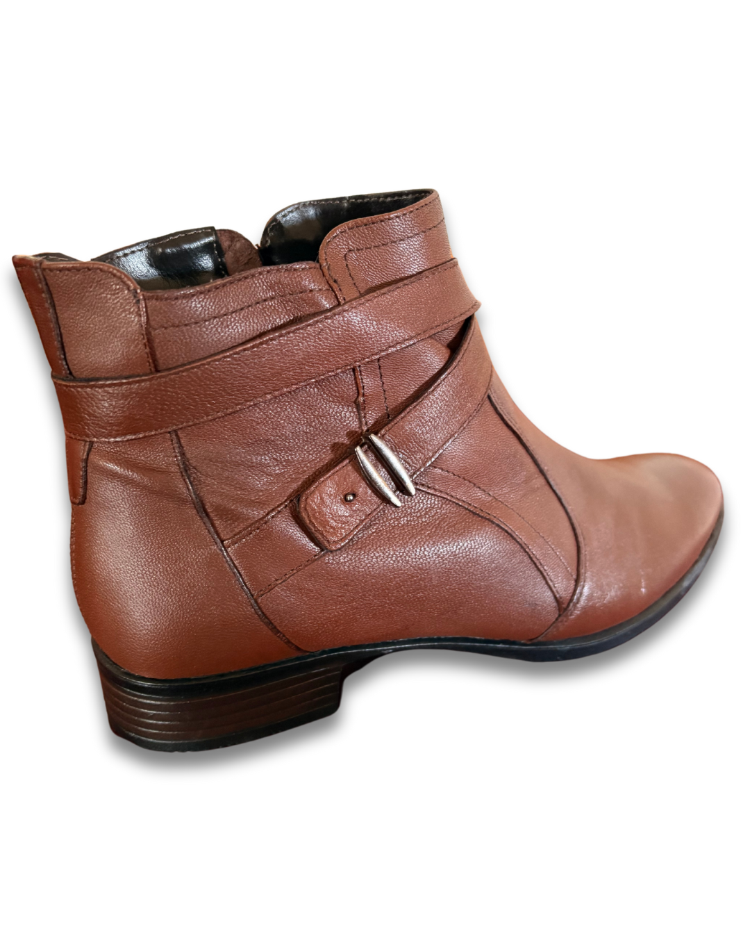 Bota feminina em couro legítimo, cano curto, salto bloco de 4 cm, palmilha macia e solado antiderrapante. Fechamento em zíper lateral. Estilo, conforto e qualidade para todas as ocasiões.