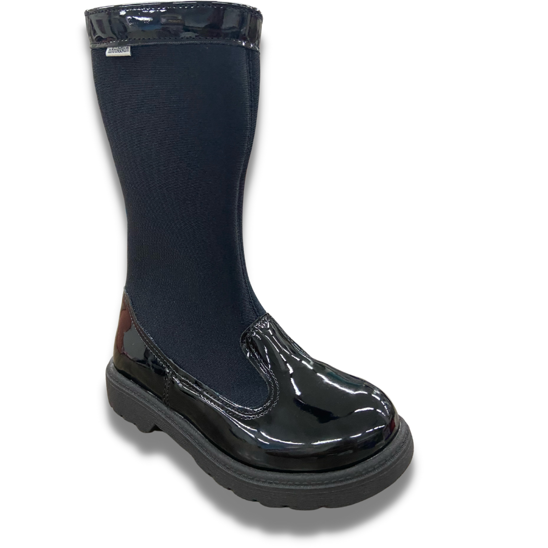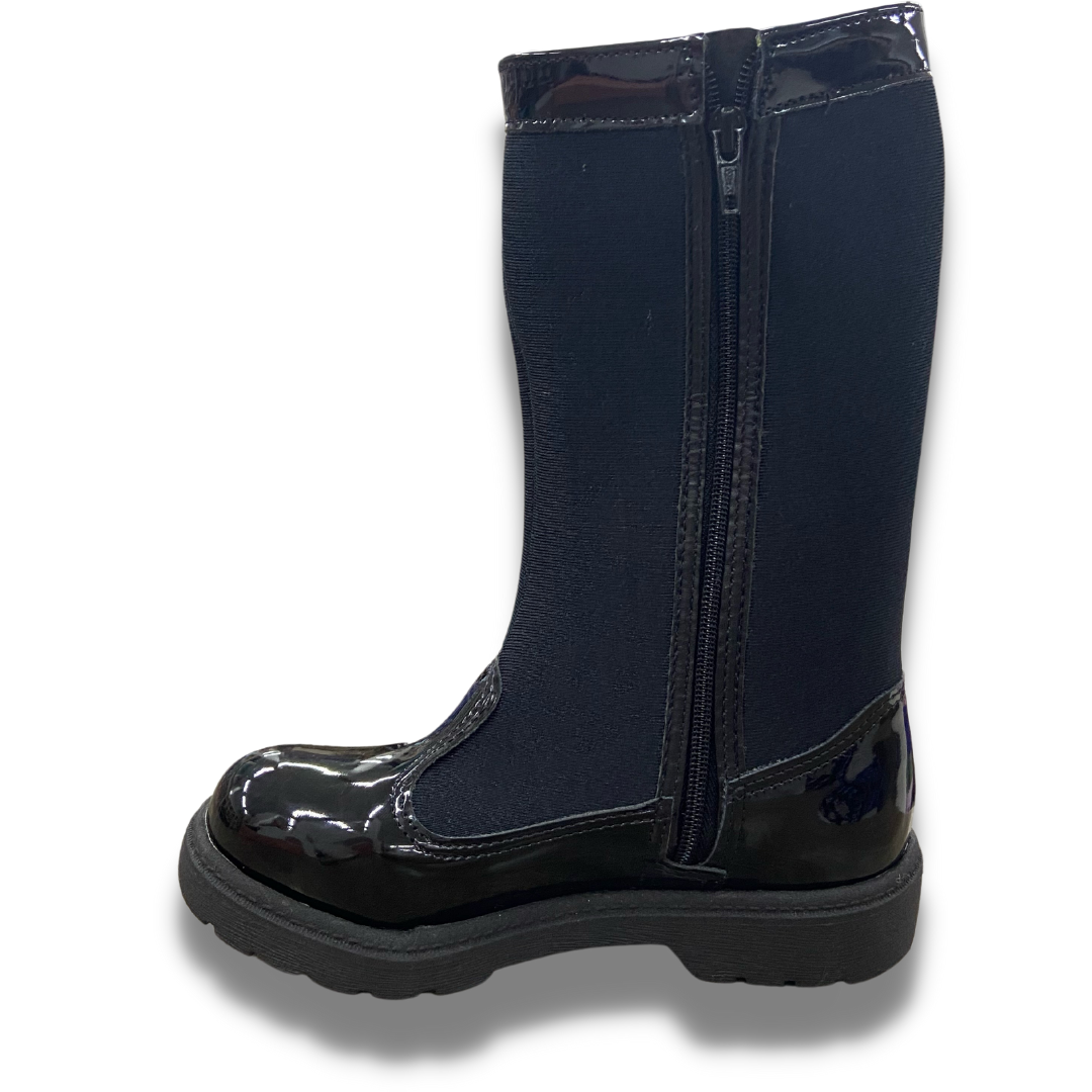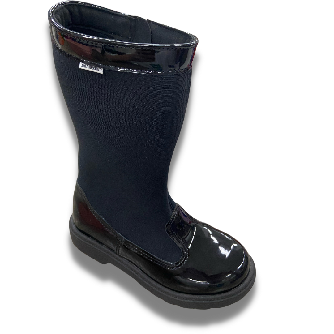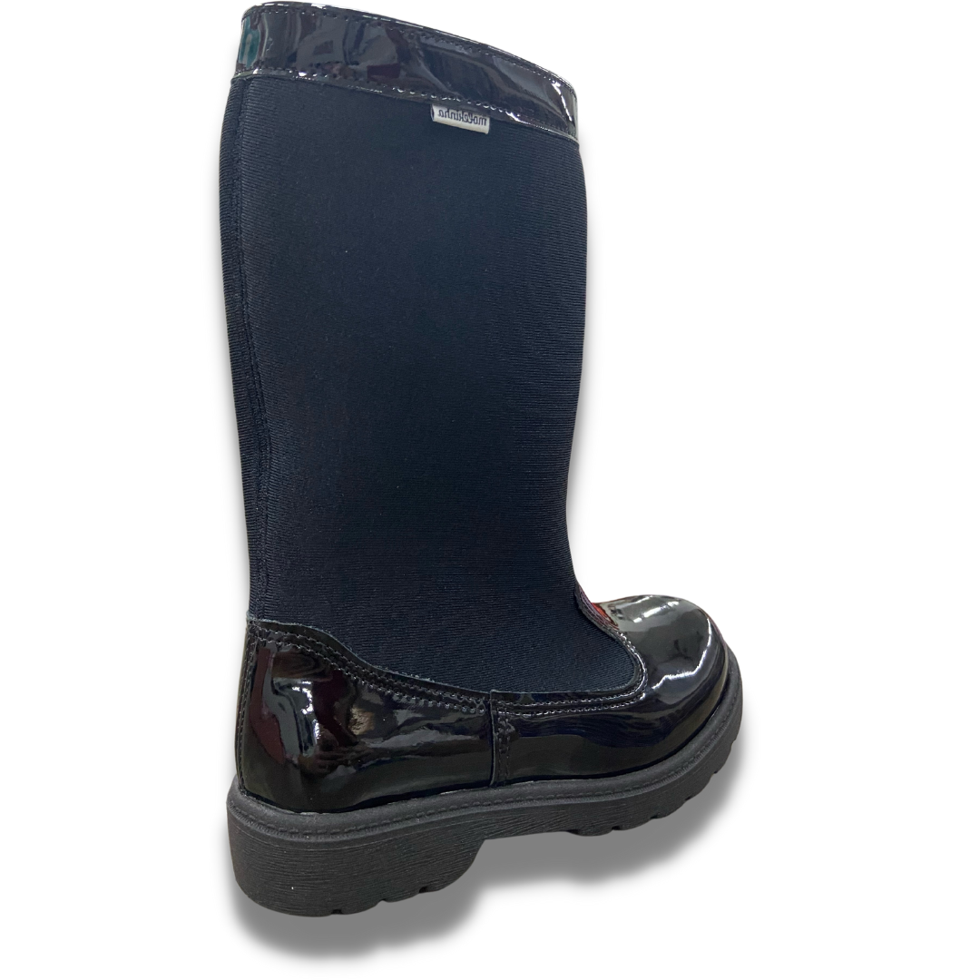 Bota infantil feminina Camin confeccionada em material têxtil nylon e material alternativo verniz. Modelo rasteiro de cano curto com recorte em pelo sintético na parte superior, bico redondo, costuras decorativas, recortes em verniz pelo cabedal e fechamento por zíper lateral. Solado emborrachado antiderrapante com 2cm de altura e forro em material têxtil. Bota cheia de charme para as pequenas.