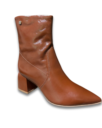 Bota feminina em couro legítimo, cano curto, salto bloco de 4 cm, palmilha macia e solado antiderrapante. Fechamento em zíper lateral. Estilo, conforto e qualidade para todas as ocasiões.