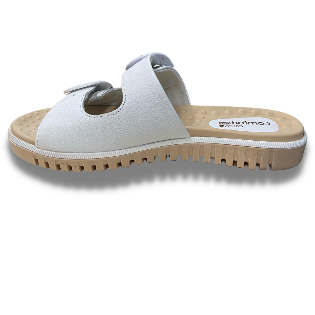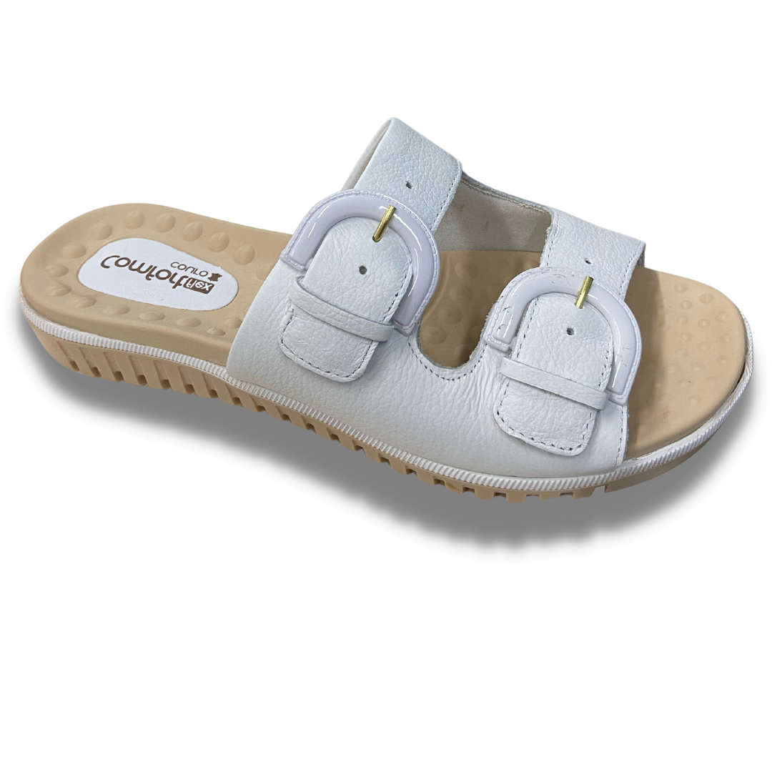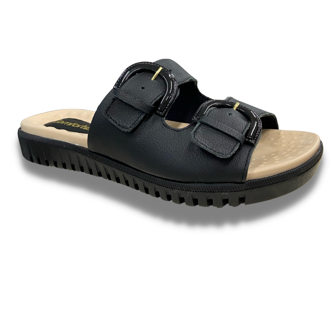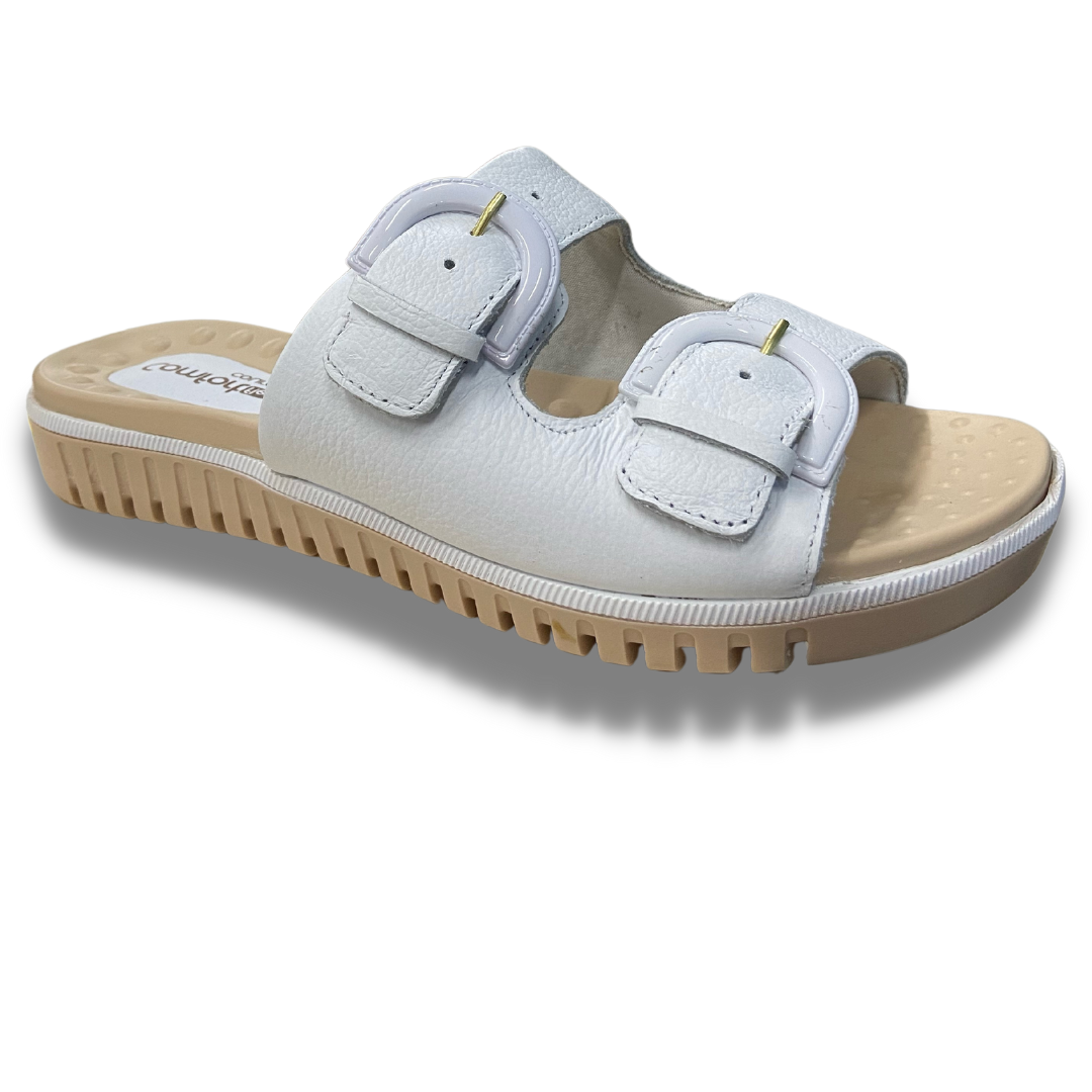 Chinelo com cabedal em couro, com as duas tiras ajustáveis para maior firmeza no pé, palmilha com esferas que massageiam e ajudam a circulação do sangue, solado de borracha antiderrapante e com fissuras para facilitar o caminhar.