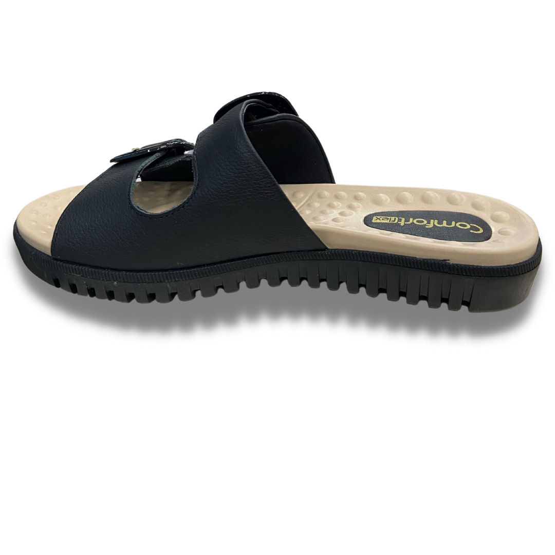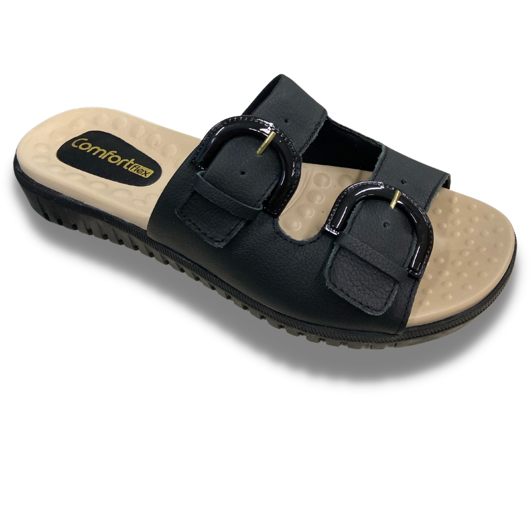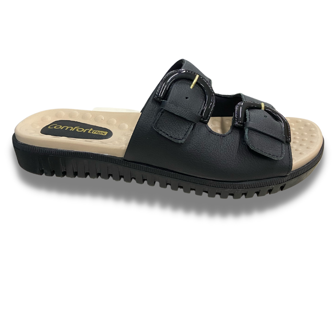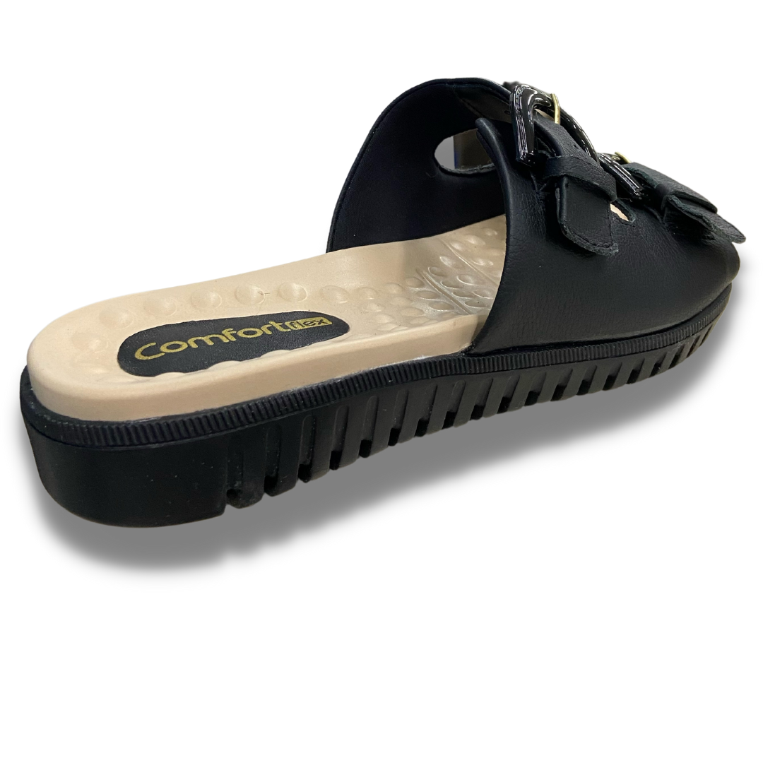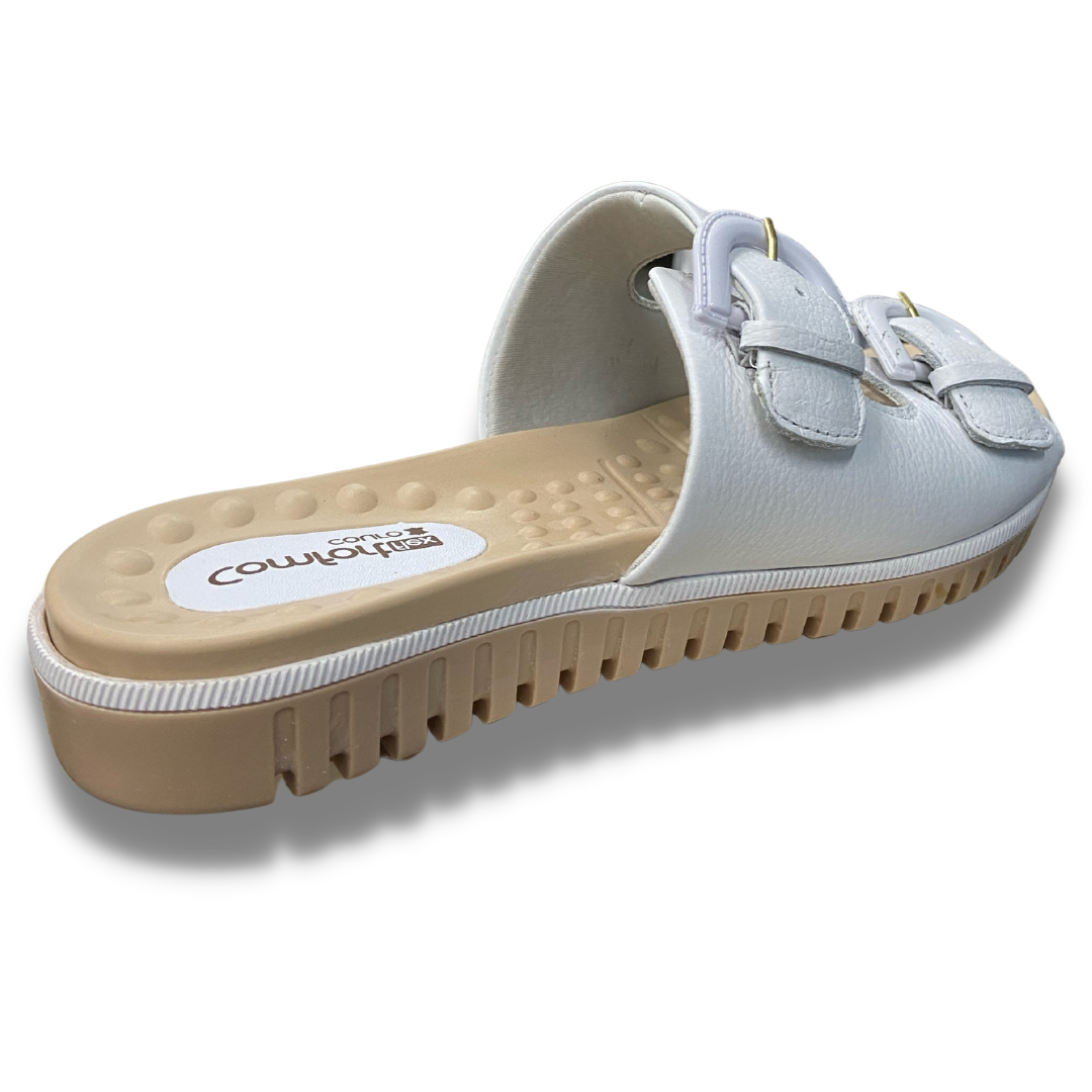 Chinelo com cabedal em couro, com as duas tiras ajustáveis para maior firmeza no pé, palmilha com esferas que massageiam e ajudam a circulação do sangue, solado de borracha antiderrapante e com fissuras para facilitar o caminhar.