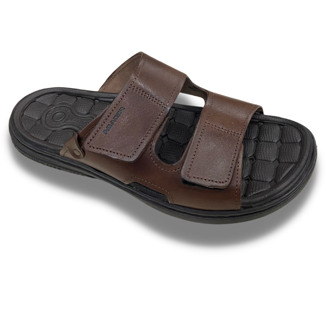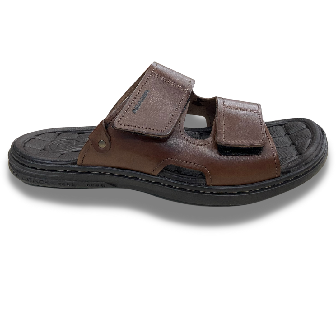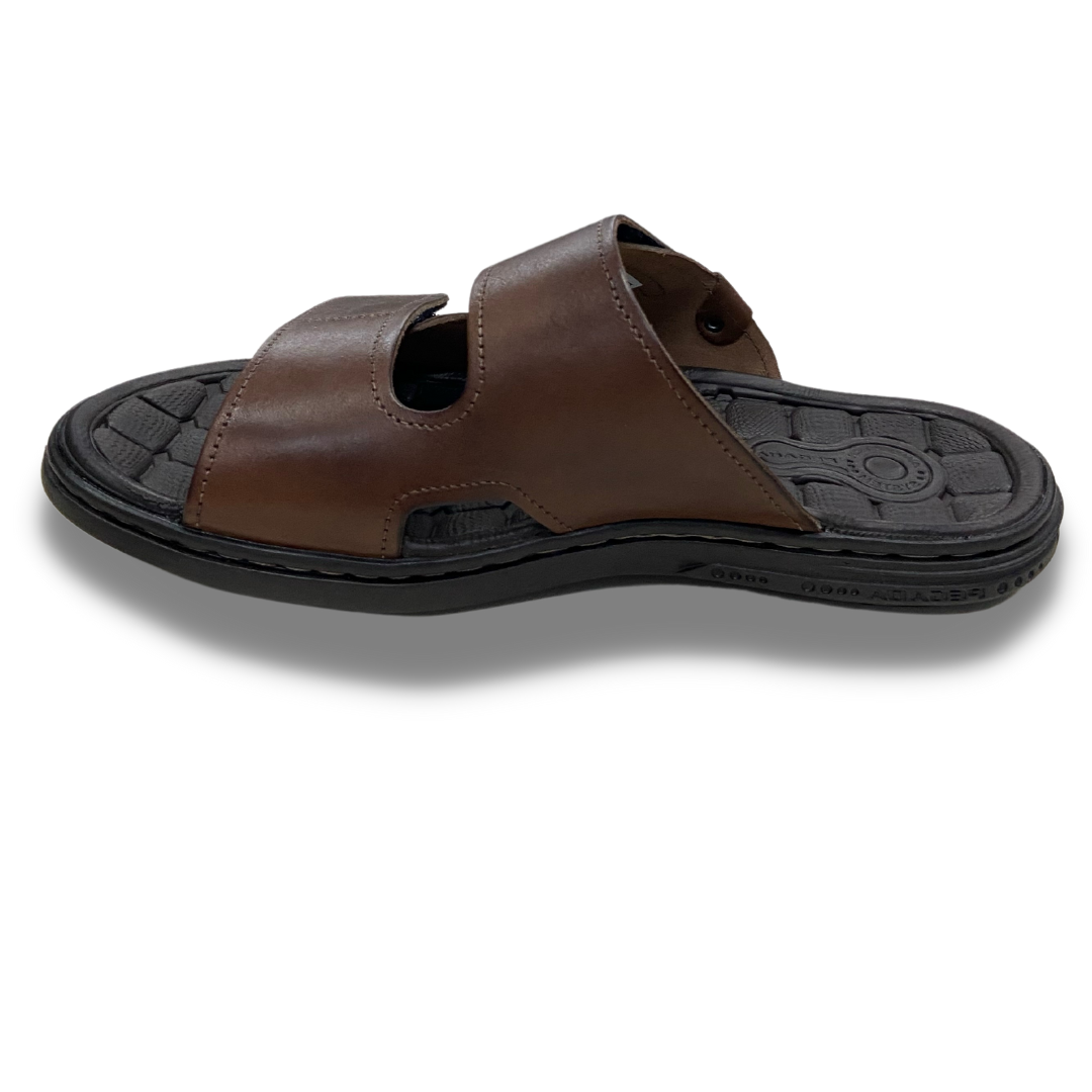 Chinelo pegada couro, palmilha com sistema AMORTECH (bolha de ar no calcanhar), solado de borracha costurado.