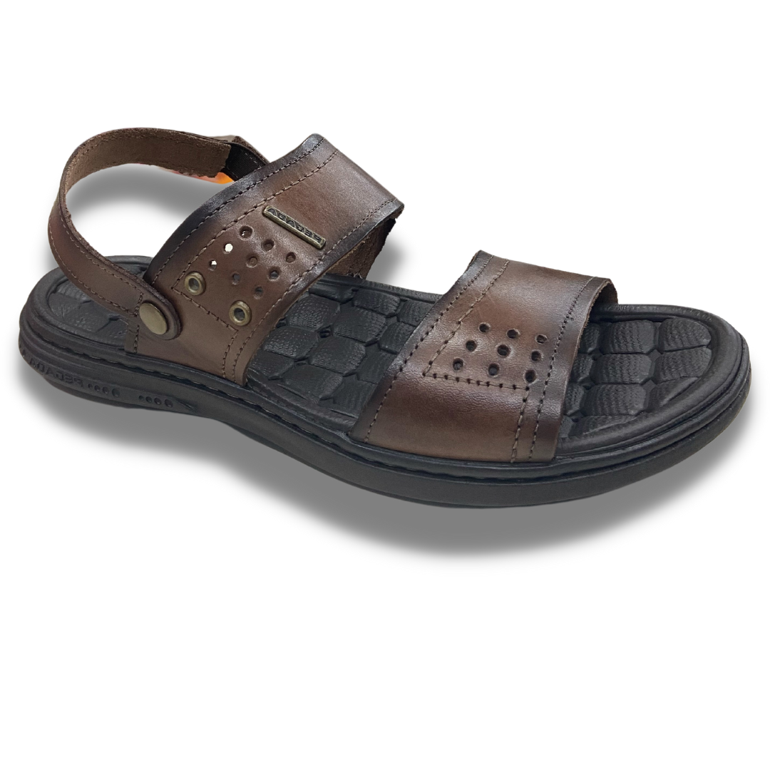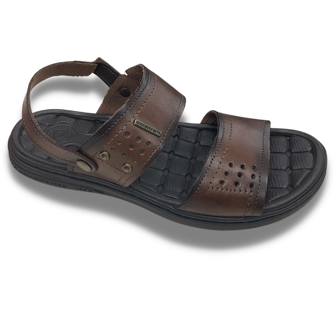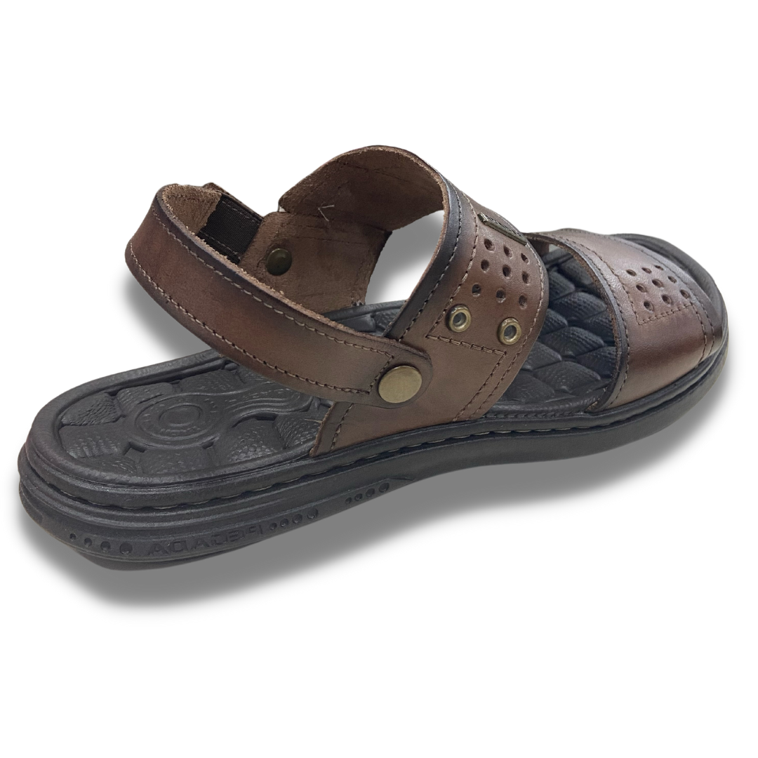 sandália que vira chinelo em couro, palmilha com sistema AMORTECH (bolha de ar no calcanhar), solado de borracha costurado.