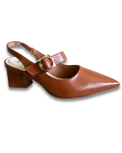é um slingback em material sintético tipo napa com acabamento refinado. O design conta com tiras slingback com ajuste em fivela que oferecem firmeza no tornozelo sem comprometer o caimento. O bico levemente afinado confere elegância, enquanto o salto bloco de aproximadamente 5,5 cm proporciona elevação sem sacrificar o conforto. O forro interno é acolchoado para conforto prolongado, e o solado possui boa aderência para uso diário. Perfeito para ocasiões casuais ou mais formais