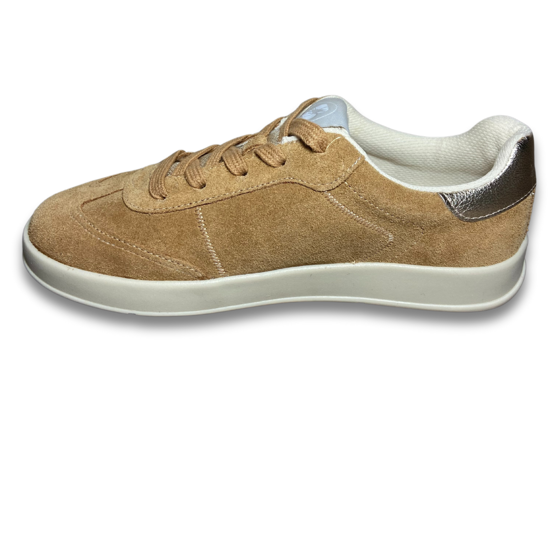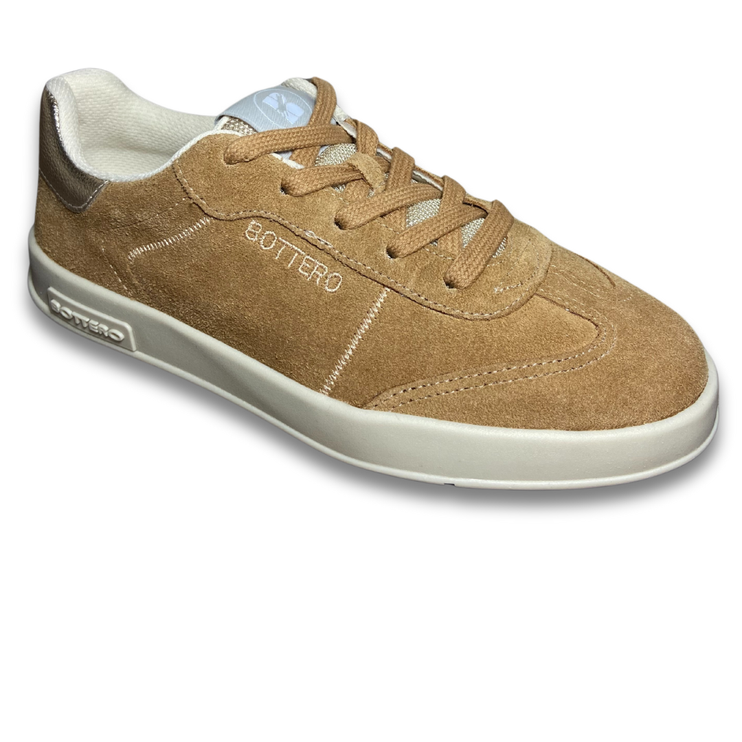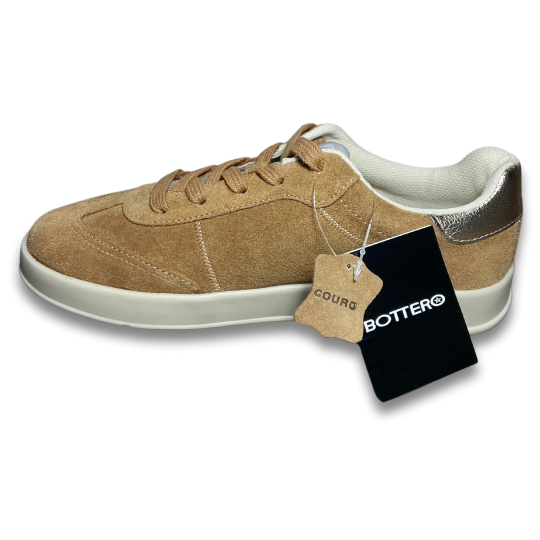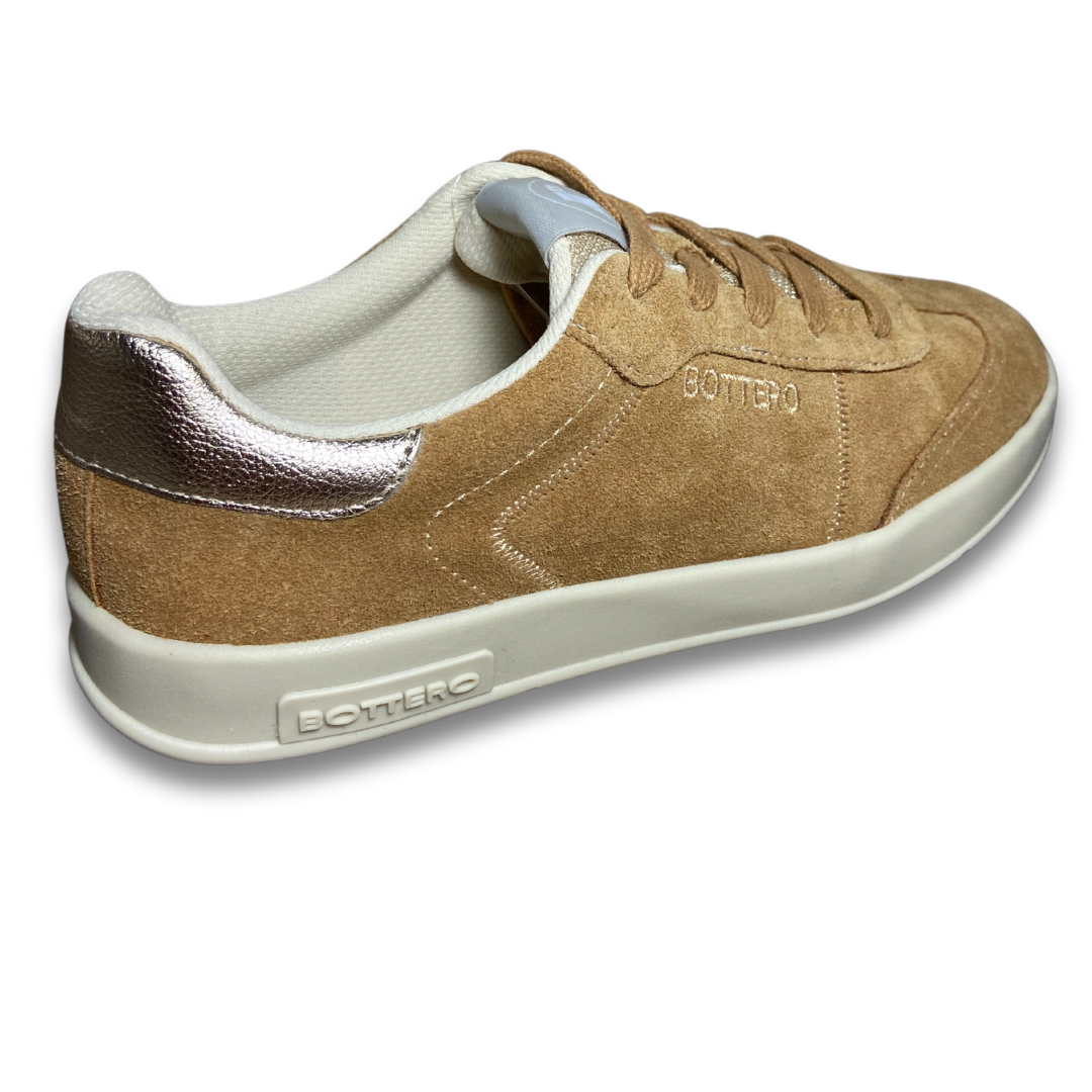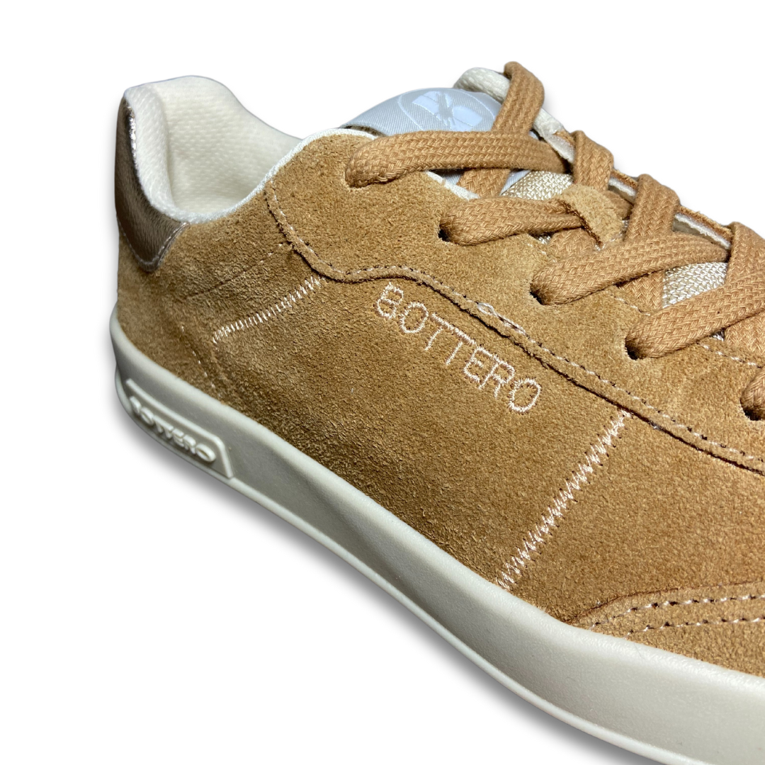 Tênis em couro camurça tan com qualidade bottero, tem solado rasteiro bege com fechamento em cadarços branco. Detalhe em dourado no traseiro. Logo da marca bordado na lateral externa do pé. Conforto em toda construção do cabedal ele vai ser seu companheiro.