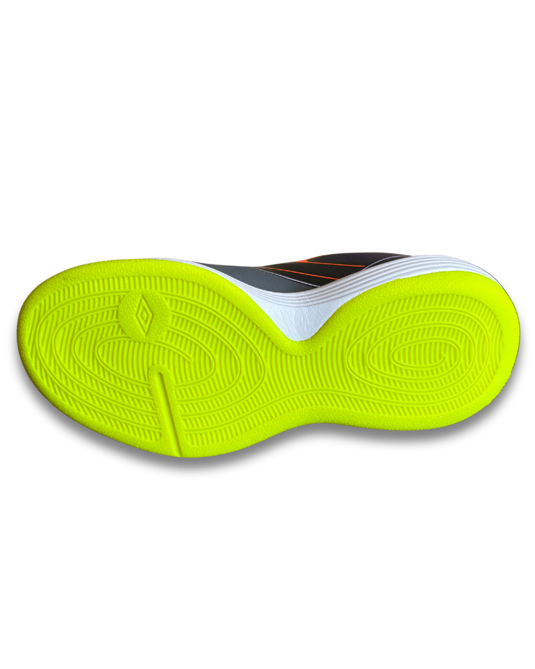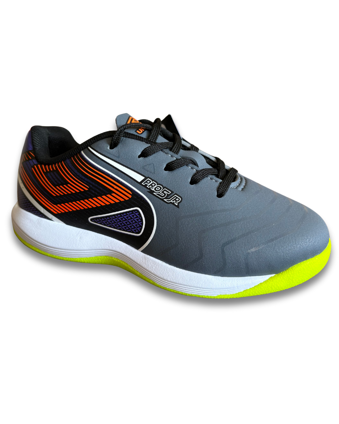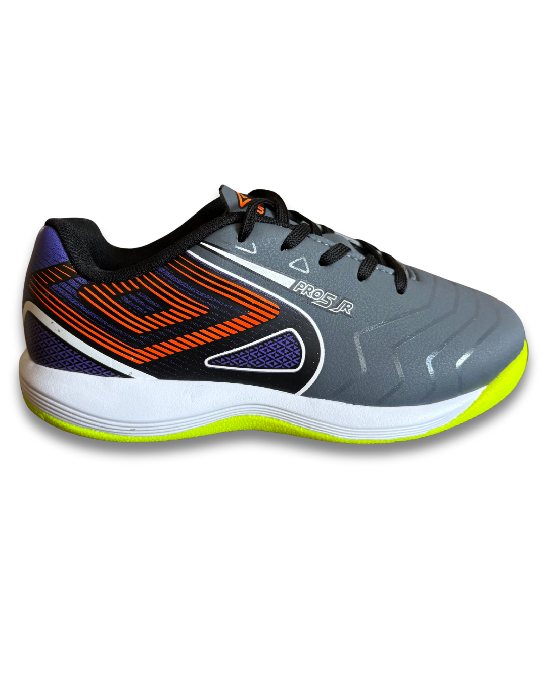 ideal para jovens atletas que buscam desempenho e conforto nas partidas indoor. O cabedal em material sintético laminado oferece resistência e toque de bola preciso. O forro em poliéster garante um ajuste confortável e respirabilidade. A palmilha em EVA + poliéster proporciona amortecimento eficiente. Já o solado misto (60 % EVA + 40 % borracha) combina leveza e aderência, sendo apropriado para quadras de futsal. O modelo oferece tração confiável e estabilidade nas movimentações rápidas. Usos ideais: treinos, jogos e prática de futsal indoor.