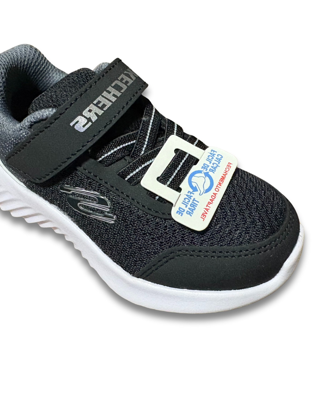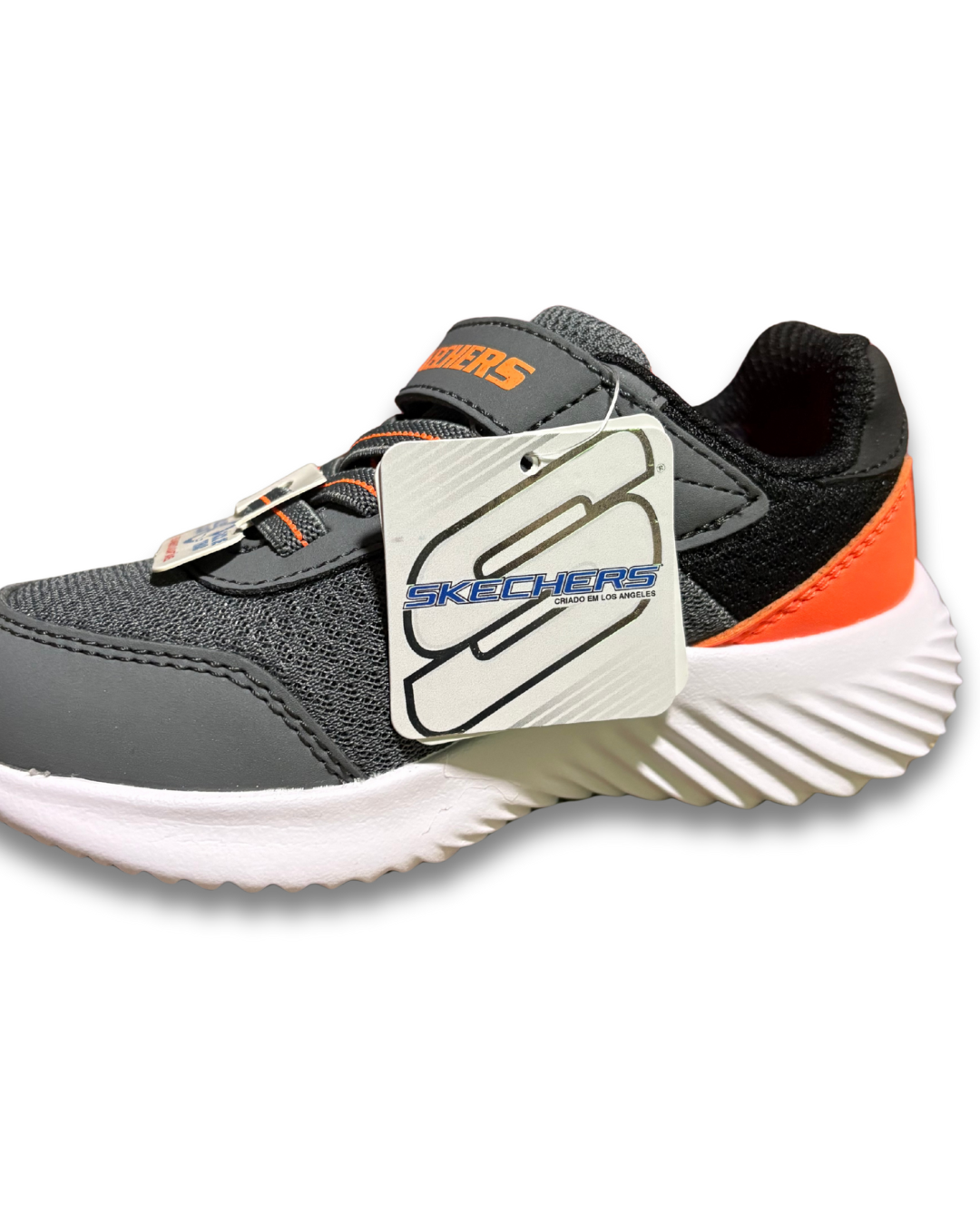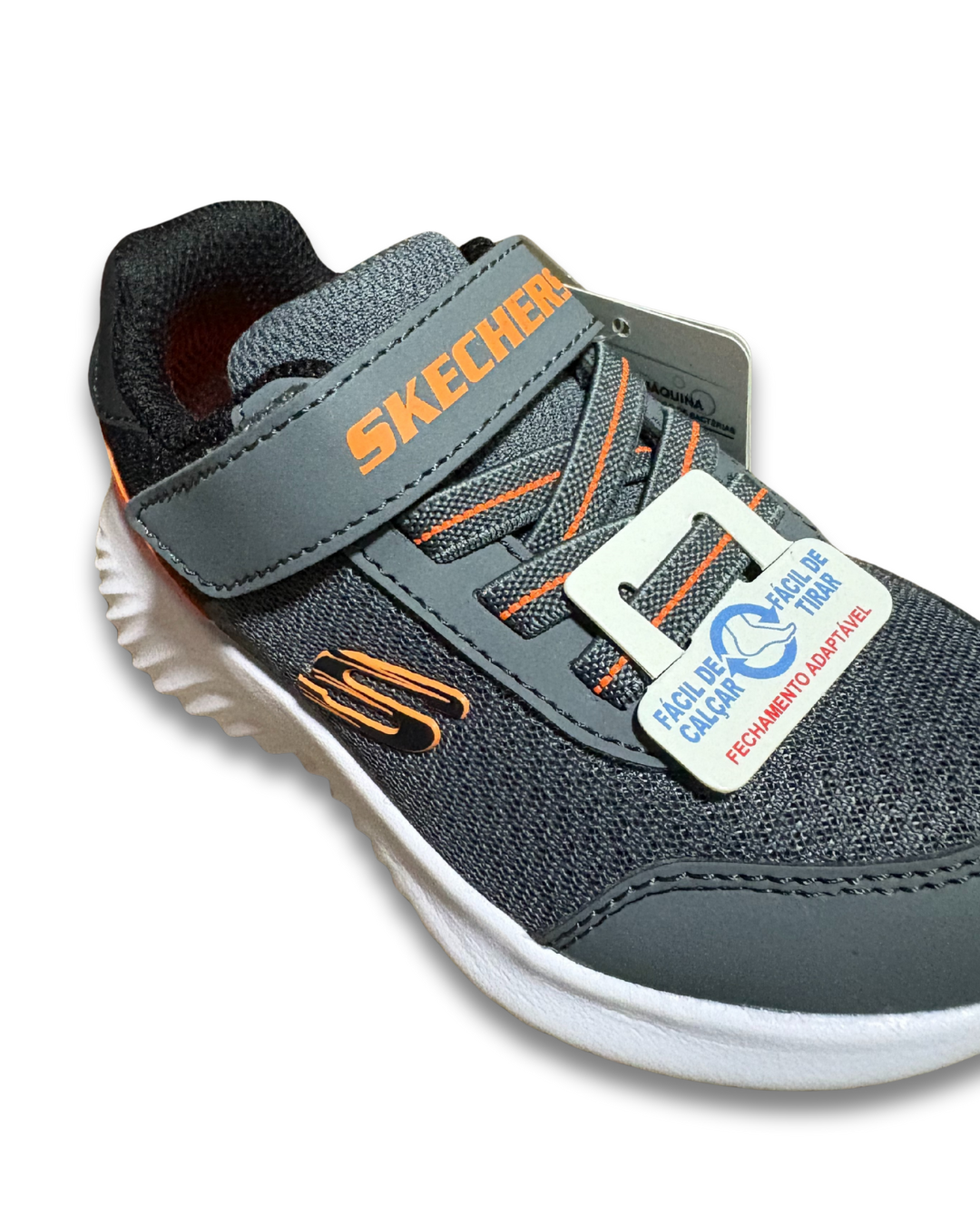 Cabedal em sintético com acabamento contrastante, cadarços elásticos com fecho de fita aderente, sola de tração flexível, detalhe do logotipo Skechers, palmilha de conforto acolchoada e entressola leve de suporte com absorção de choque.