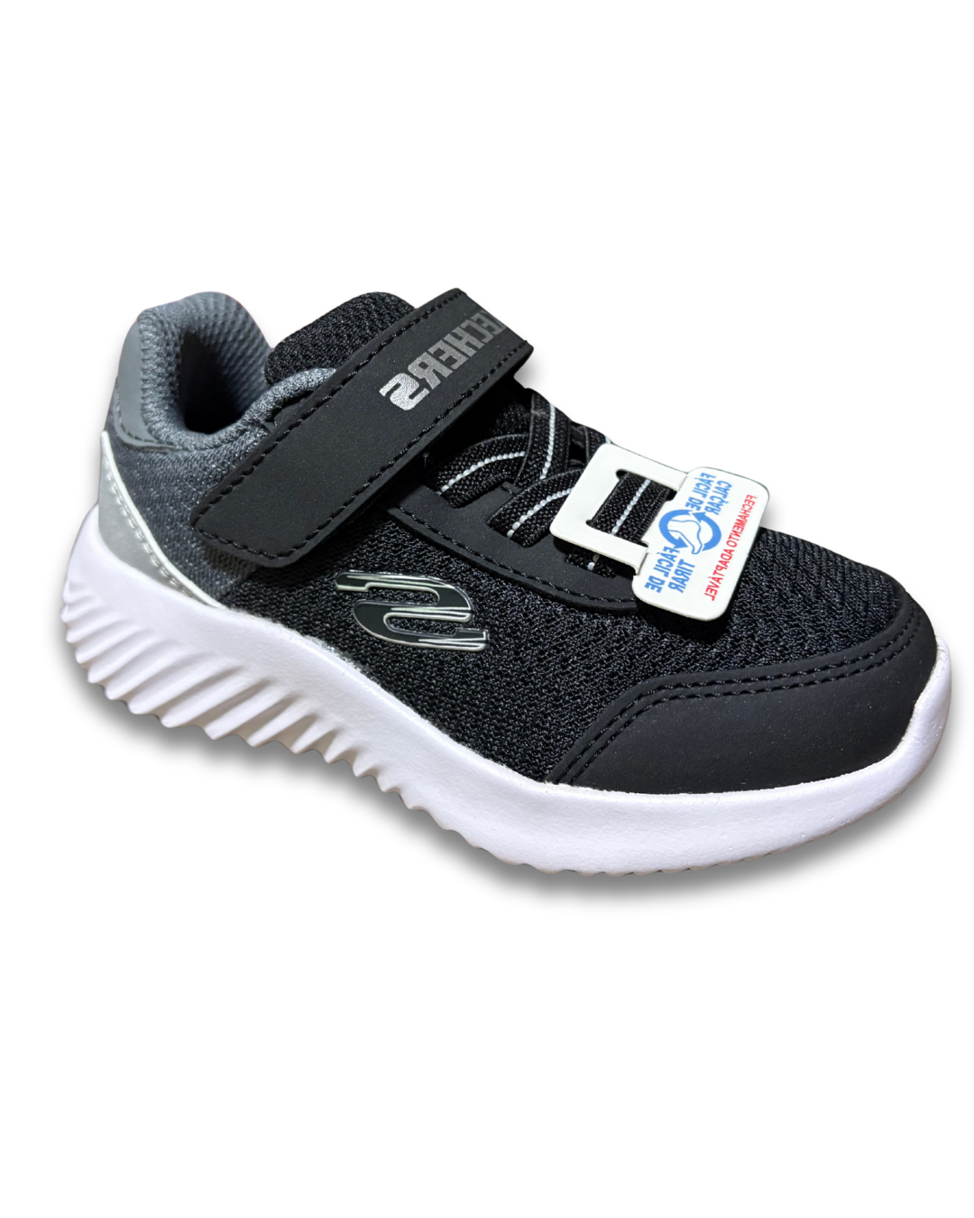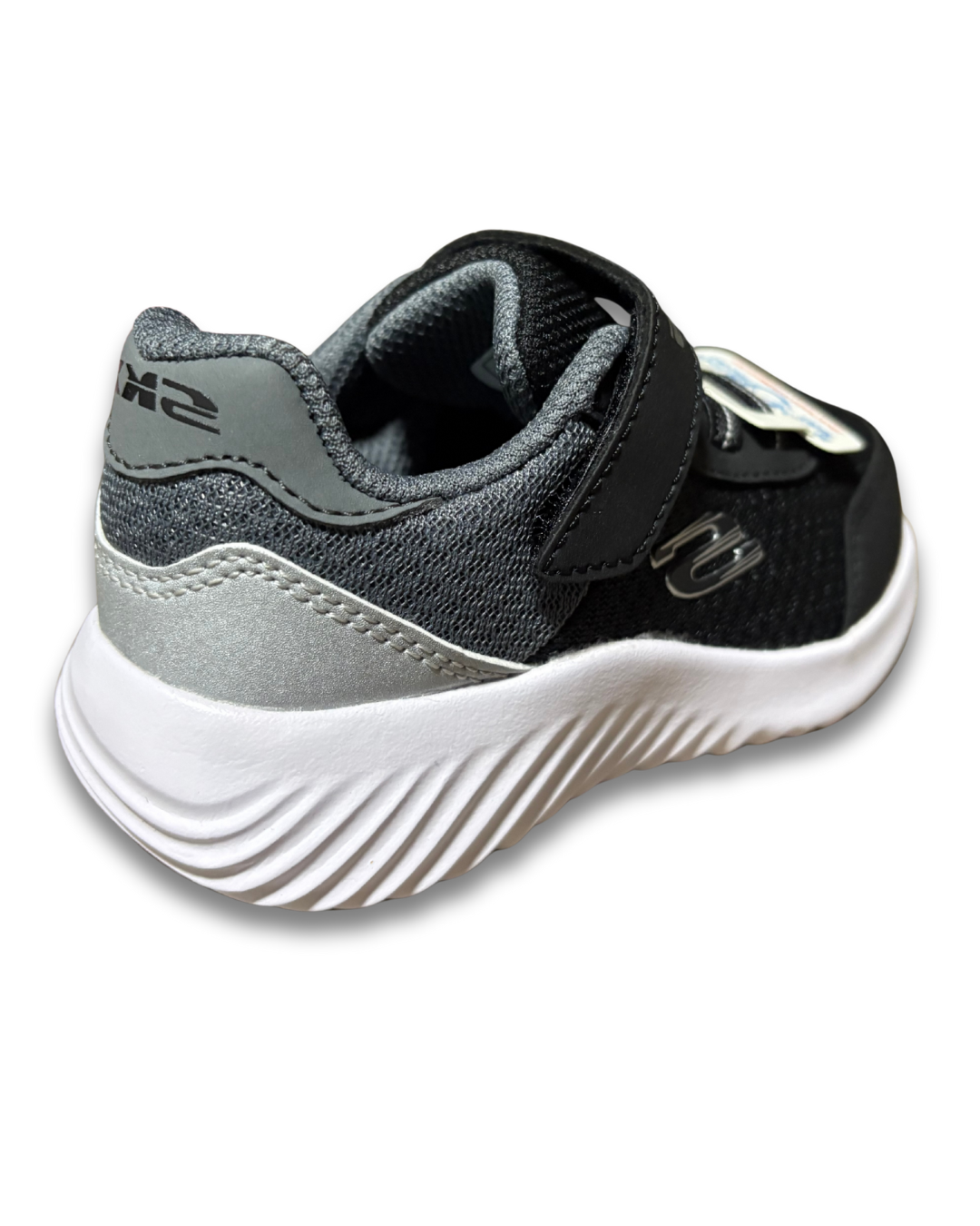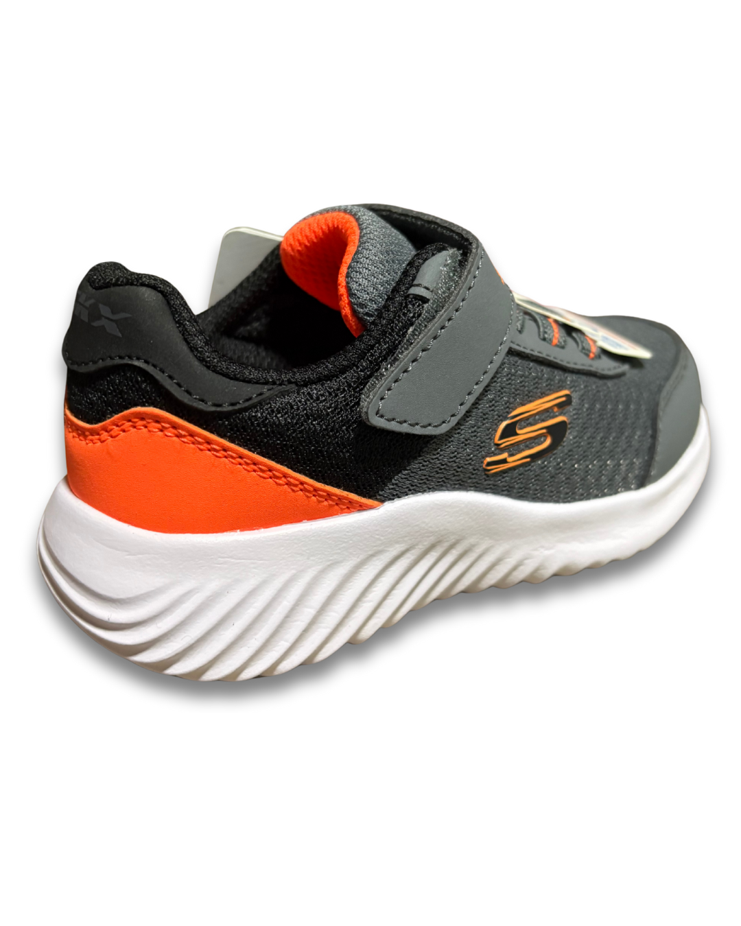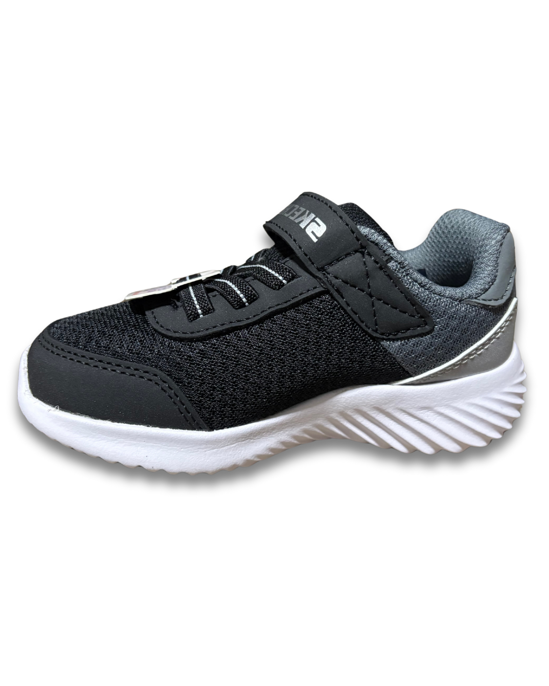 Cabedal em sintético com acabamento contrastante, cadarços elásticos com fecho de fita aderente, sola de tração flexível, detalhe do logotipo Skechers, palmilha de conforto acolchoada e entressola leve de suporte com absorção de choque.
