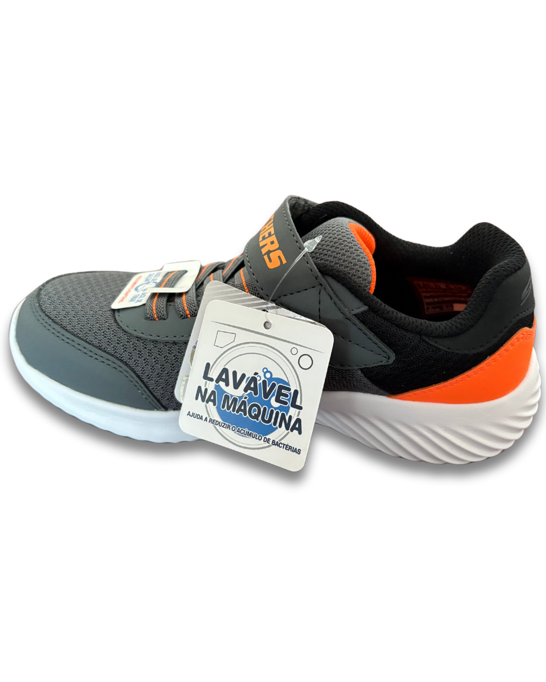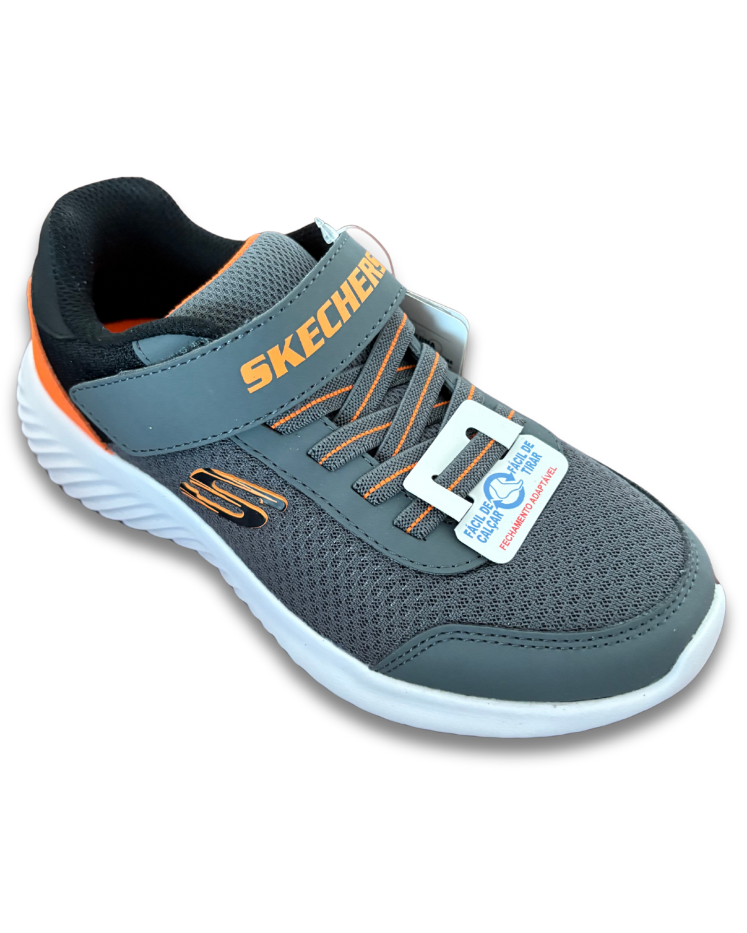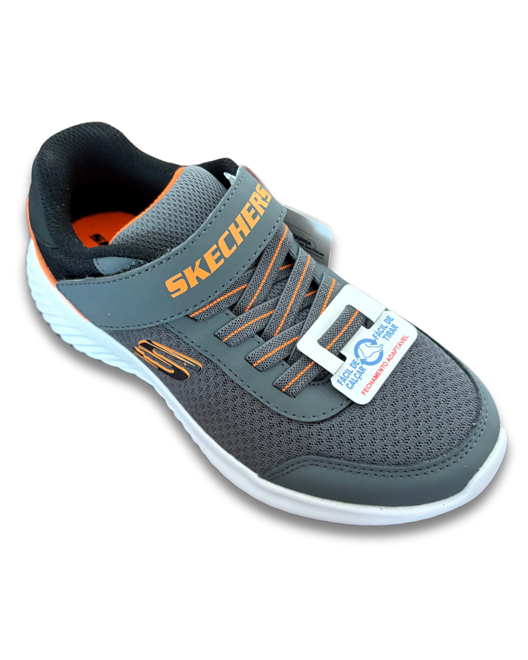 Cabedal em sintético com acabamento contrastante, cadarços elásticos com fecho de fita aderente, sola de tração flexível, detalhe do logotipo Skechers, palmilha de conforto acolchoada e entressola leve de suporte com absorção de choque.