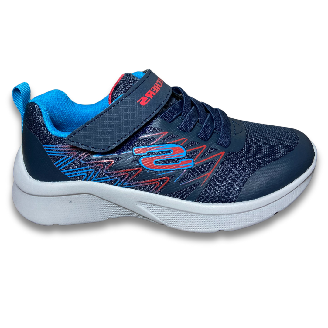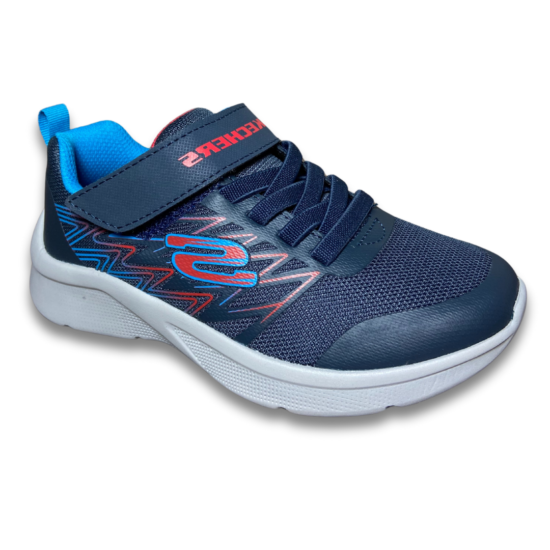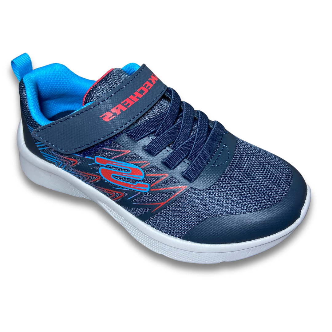 Cabedal em sintético com acabamento contrastante, cadarços elásticos com fecho de fita aderente, sola de tração flexível, detalhe do logotipo Skechers, palmilha de conforto acolchoada e entressola leve de suporte com absorção de choque.