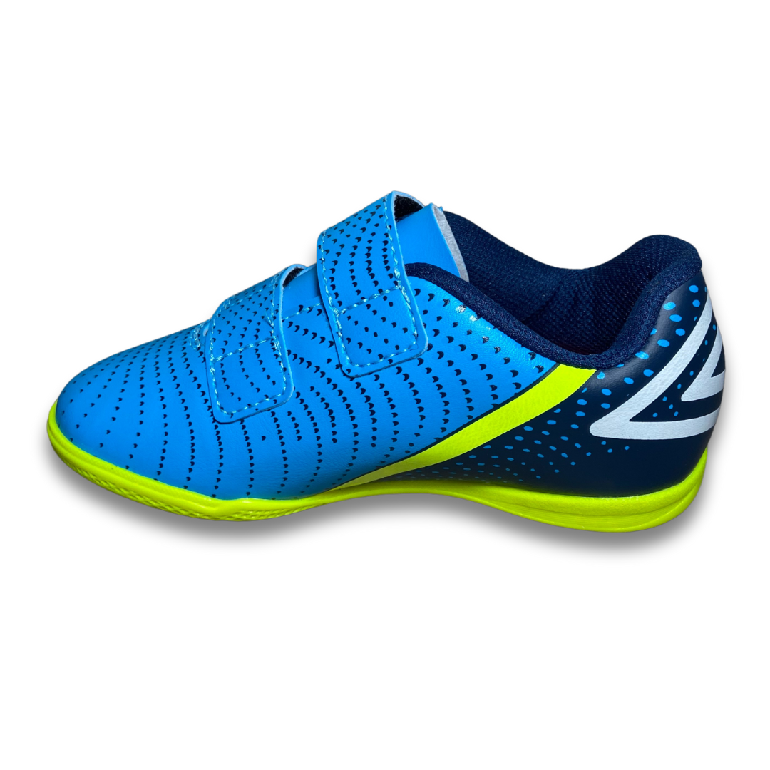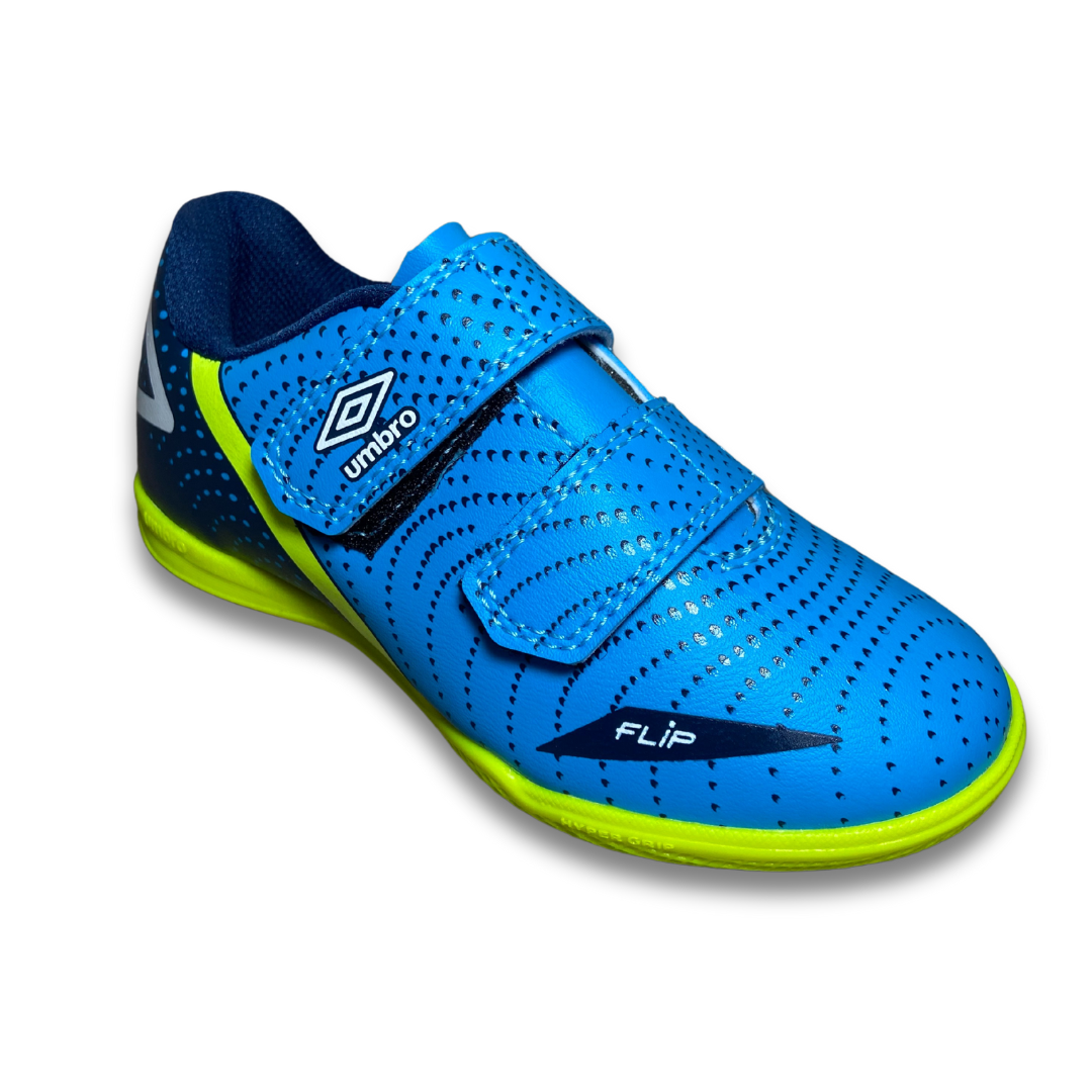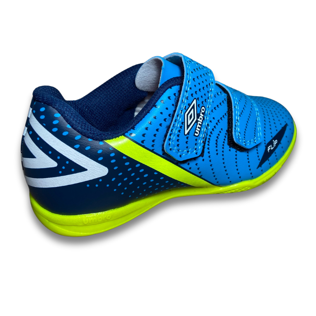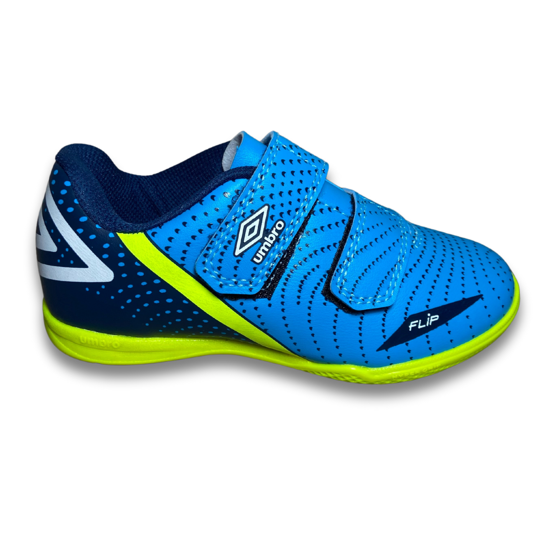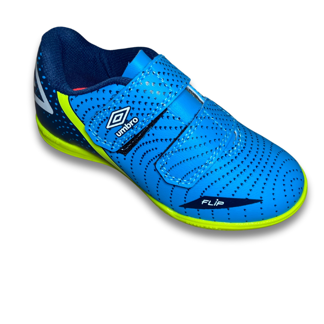 A Chuteira Futsal Umbro Flip Kids, desenvolvida exclusivamente para os jogadores mirins, vem com fechamento duplo em velcro, que garante praticidade e agilidade no calce, e cabedal em material laminado de fácil manutenção e limpeza. Os grafismos e detalhes estéticos do modelo trazem cores intensas e divertidas para as partidas e treinos. Cabedal confeccionado em material laminado. Possui grafismo com ilusão de ótica que passam a sensação de movimento, ajuste e fechamento em tiras duplas de velcro, Diamante Umbro aplicado na parte traseira e palmilha macia em EVA com tecido forrado. O solado de futsal é construído em borracha colorida com função antiderrapante.